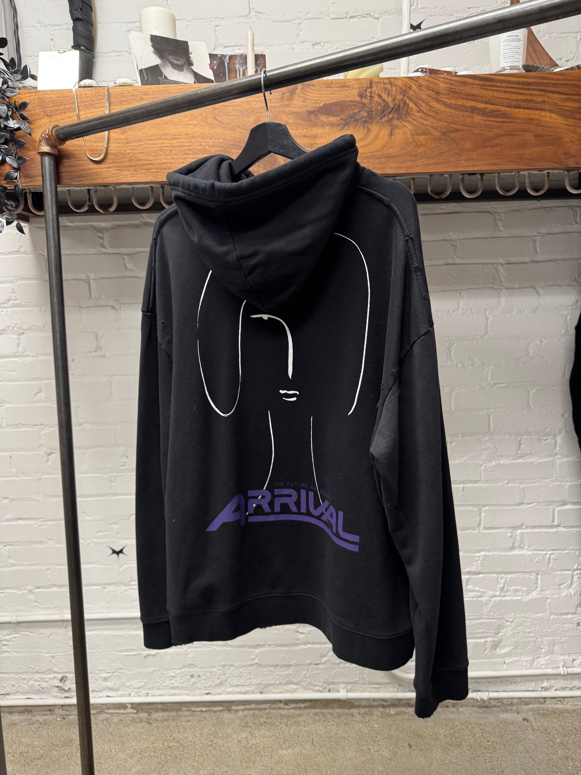 For sale is an AW2020 Raf Simons ‘Arrival’ Black/Purple Distressed Pullover Hoodie