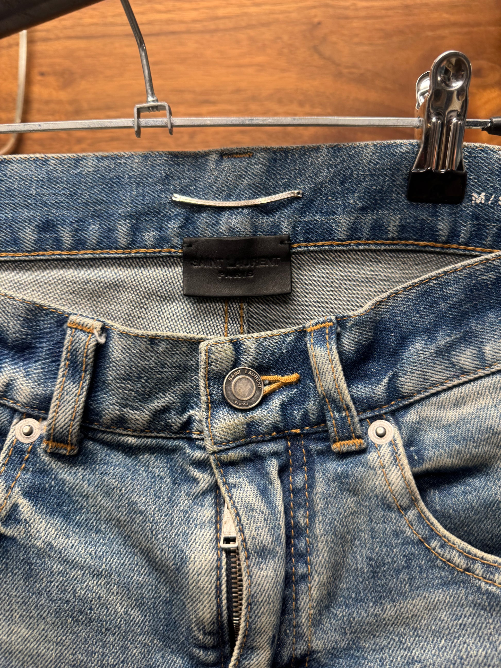 -Saint Laurent’s signature ‘D14’ cut jeans, with a skinny stacked fit, coming in this dirty washed blue color with distressing around the knees.