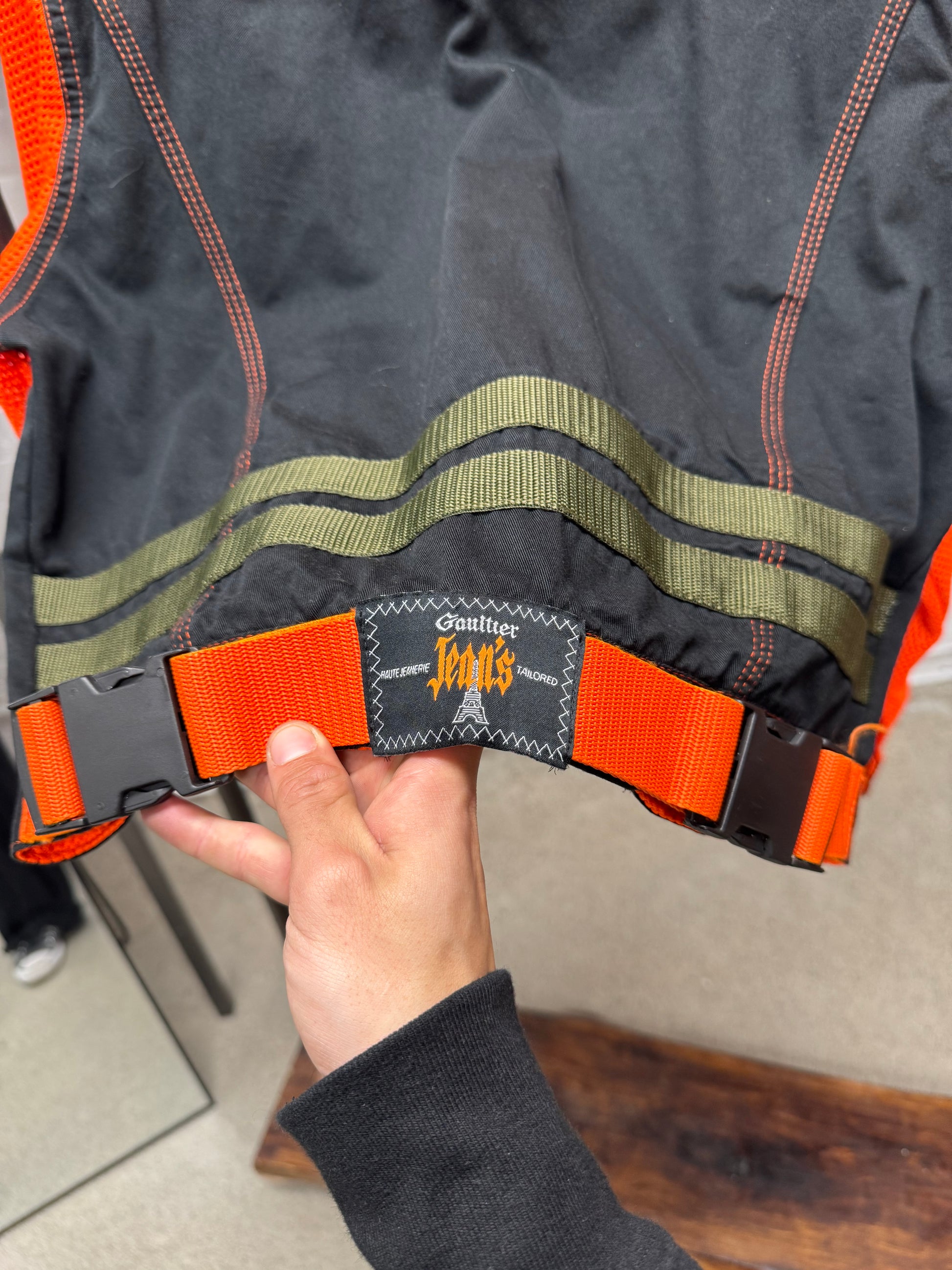 -super interesting trucker jacket from the ‘Gaultier Jeans’ label. Unconventional mesh material choice paired with bondage straps and strap closures along the bottom waistline.