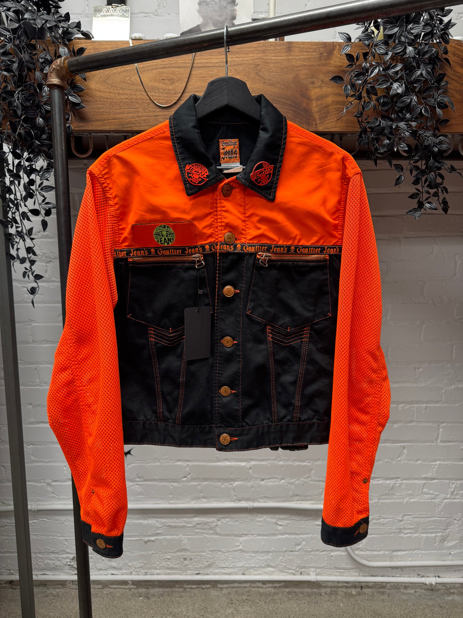 For sale is a Vintage 90s Jean Paul Gaultier Mesh/Denim Hybrid Trucker Jacket