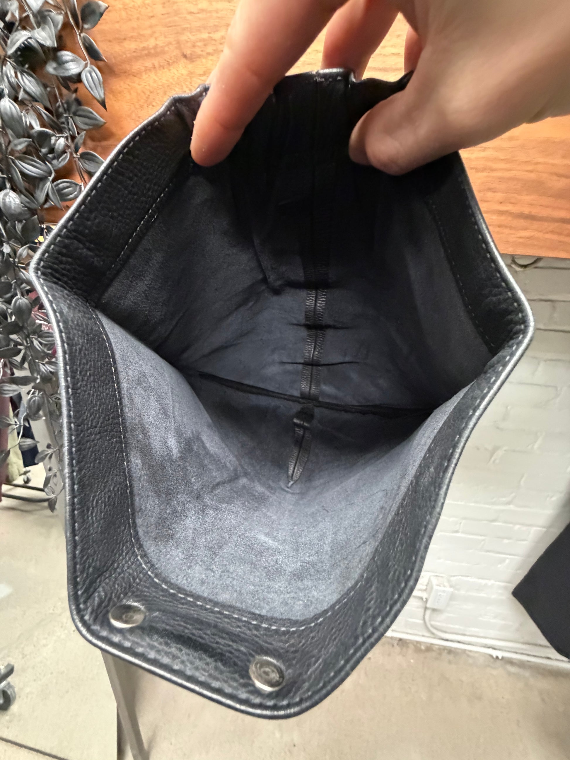 -tumbled black calfskin leather with a raw unlined black suede interior. 925 Silver scroll logo across the front