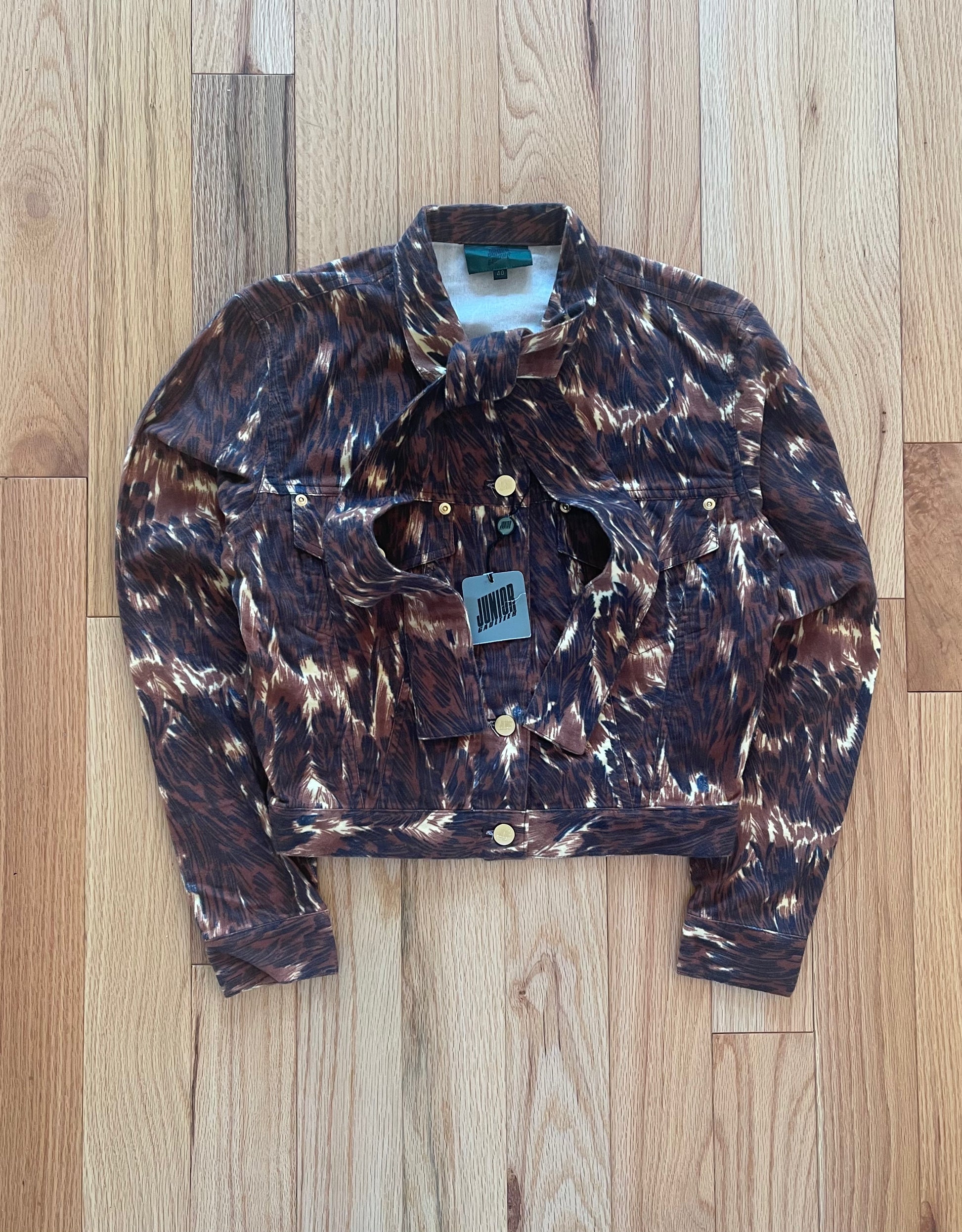For sale is a vintage pair of Jean Paul Gaultier animal print denim biker jacket. Coming brand new with tags, this jacket features a tie collar that’s capable of being styled in multiple ways. Here is the opportunity to purchase a timeless piece from JPG’s history.