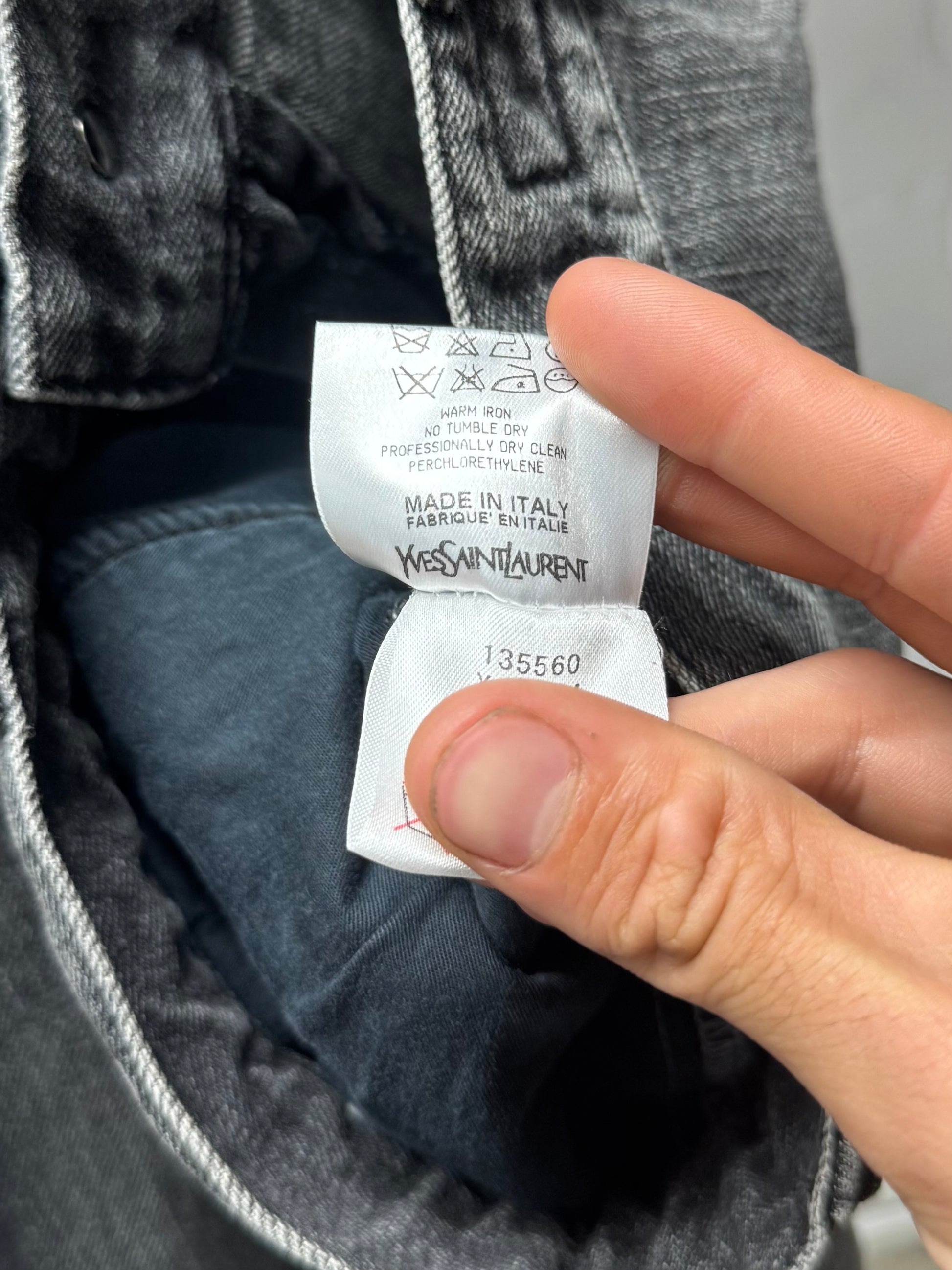 -pocket fade with YSL logo worn and worked into the wash of the jeans. Good stuff from Rive Gauche.