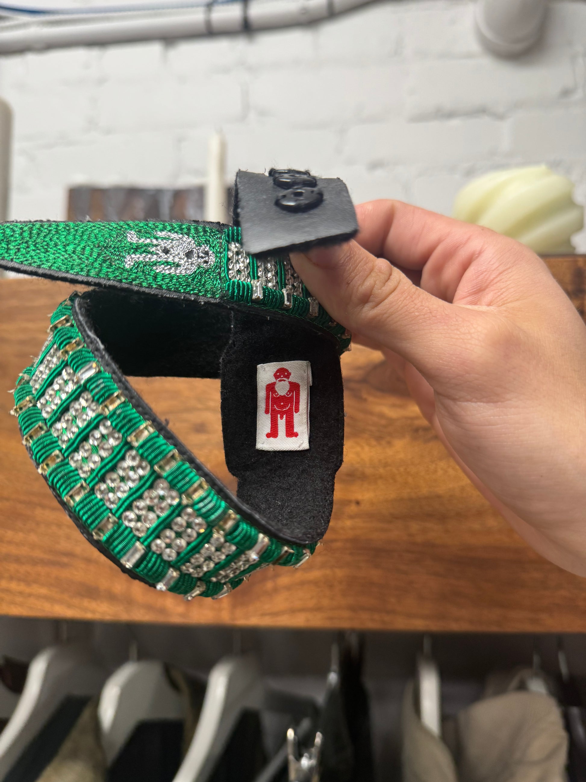 For sale is a Walter Van Beirendonck ‘Snake Watch’ Bracelet. Using a green embroidered base layer, we’re invited into Beirendonck’s state of mind with beading and ornate trinkets that make up this fake watch face. A silly and playful piece from Walter Van Beirendonck, here is the opportunity to purchase a rare accessory from Walter Van Beirendonck.