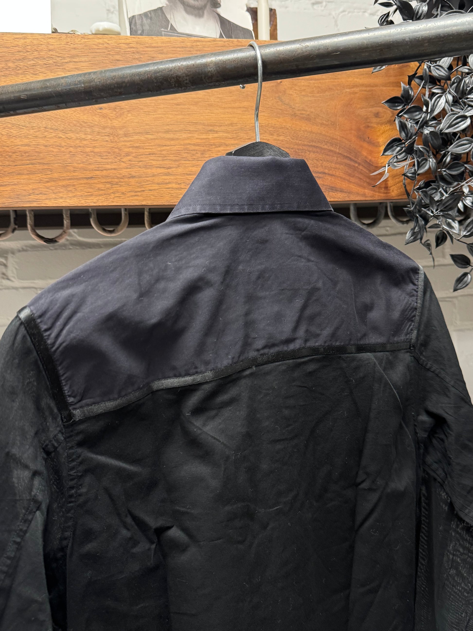 -sheer black panelling mixed with a deep purple cotton. Some more glossy black trim around the seamlines to accent the panelling